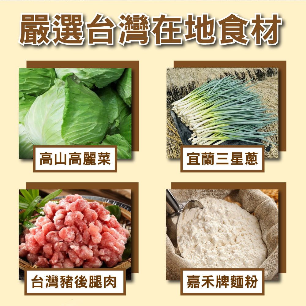 成分:麵粉、韭菜、水、豬肉(台灣) 、高麗菜、大豆沙拉油、薑、釀造醬油、糖、鹽、大豆蛋白(非基因改造) 、黑胡椒粉、明膠
