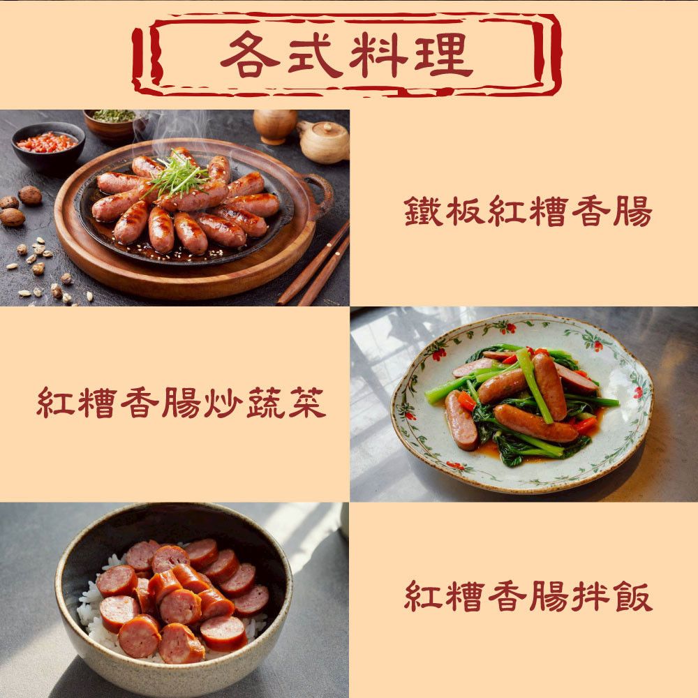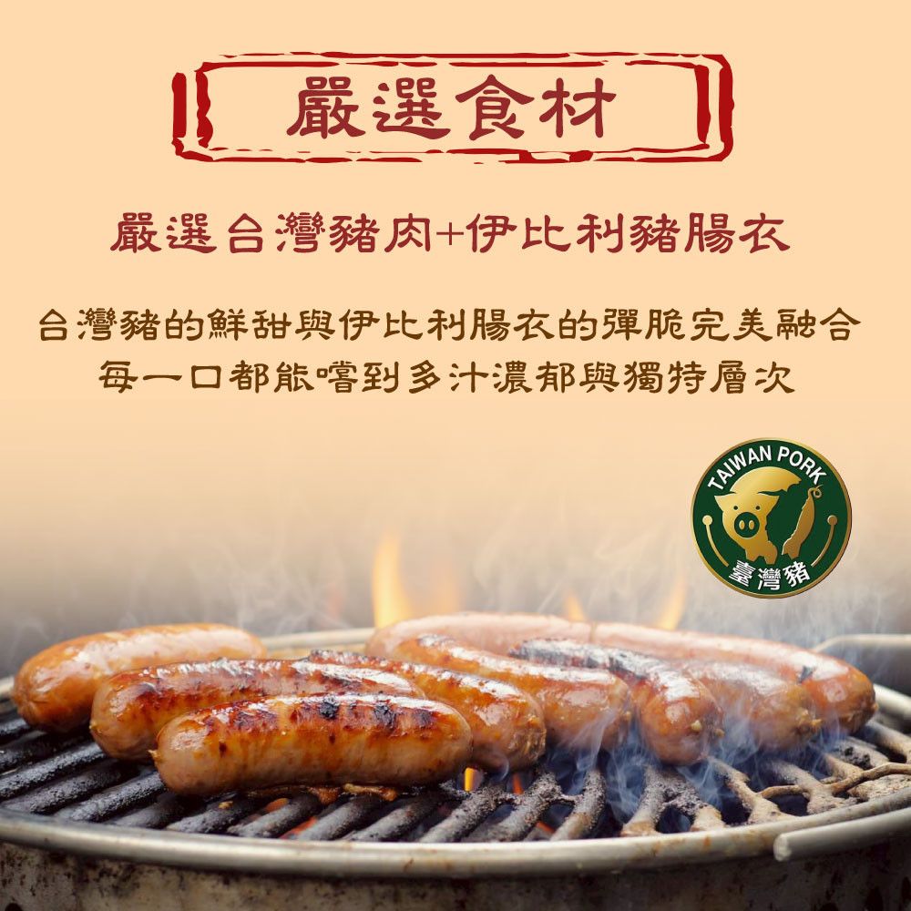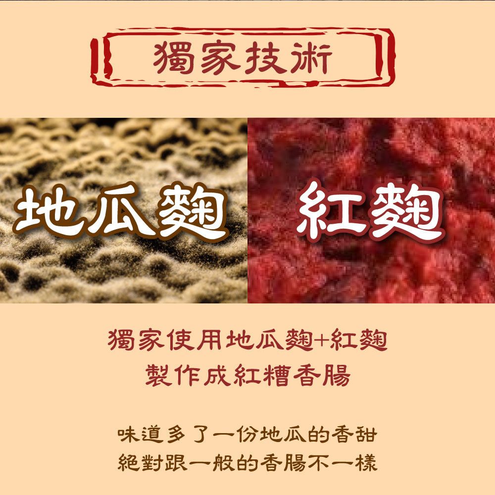 成份:豬肉(台灣)、豬背脂(台灣)、糖、豬腸衣(西班牙)、水、紅麴醬(米、水、紅麴)、鹽、味精、磷酸二澱粉、品質改良劑(己六醇)、大豆蛋白、酪蛋白鈉、天然香料、鹿角菜膠、葡萄糖、乳糖、5-次黃嘌呤核苷磷酸二鈉、5-鳥嘌呤核苷磷酸二鈉、調味料[麥芽糊精、植物水解蛋白(大豆、玉米、小麥)、鹽、調味劑(味精、5-次黃嘌呤核苷磷酸二鈉、5-鳥嘌呤核苷磷酸二鈉、琥珀酸二鈉、DL-胺基丙酸、胺基乙酸)、豬油(日本)、豬抽出物、酵母抽出物、洋蔥抽出物、葡萄糖、香料、D-木糖]、複方磷酸鹽(多磷酸鈉、焦磷酸鈉、偏磷酸鉀)、抗氧化劑(異抗壞血酸鈉)、亞硝酸鈉、肉精香料(中鏈三酸甘油酯、香料)、二氧化矽