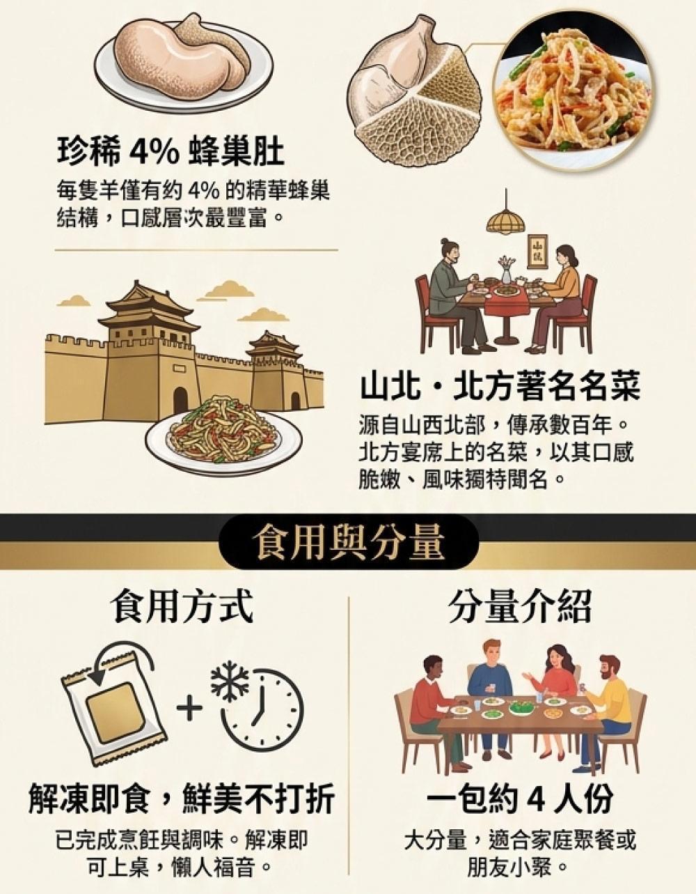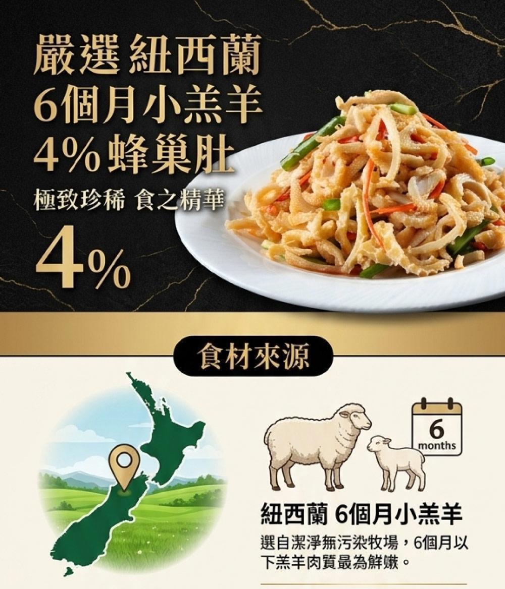 成分:羊肚(紐西蘭)、醬油膏[水、食鹽、樹薯澱澱粉、大豆胺基酸液、釀造醬液(水、基因改造黃豆、小麥、食鹽)、黏稠劑(乙醯化己二酸二澱粉)、著色劑(焦糖色素)、調味劑(琥珀酸二鈉、L-麩酸鈉)、防腐劑(苯甲酸)、甜味劑(醋磺内酯鉀、甘草萃)、調味劑(DL-蘋果酸、DL-胺基丙酸、胺基乙酸、5-鳥嘌吟核磷酸二鈉、5-次黃嘌哈核苷磷酸二鈉)、甜味劑(紐甜)、冰糖、香油【芝麻油、大豆油】、鹽、辣椒醬【辣椒、鹽、精製糖、苯甲酸1.0g/kg(防腐劑)、醋磺内酯鉀(甜味劑)、檸檬酸、檸檬酸鈉、甘草萃(甜味劑)、L-麩酸鈉、胺基乙酸、L-天門冬酸鈉、5-次黃嘌呤核苷磷酸二鈉、嘌呤核苷磷酸二鈉)、DL-胺基丙酸、琥珀酸二鈉、乙烯二胺四醋酸二鈉(抗氧化劑)、多磷酸鈉、關華豆膠〕、八角、肉桂粉、甘草粉[甘草粉、麥芽糊精〕